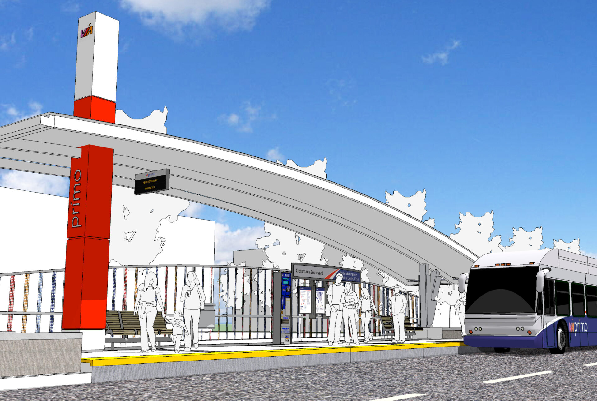 The design work extended beyond the stations to encompass all passenger touchpoints for the BRT service. Station signage was developed to include the iconic brand pylon that became a landmark feature of the system, along with platform informational elements that helped riders navigate the service easily. Fleet graphics were designed to complement the station branding, creating a unified visual system across all aspects of the service. The comprehensive approach ensured that every element, from the smallest wayfinding sign to the largest station identifier, worked together to communicate the premium nature of the Primo service and reinforce VIA’s commitment to high-quality transit.